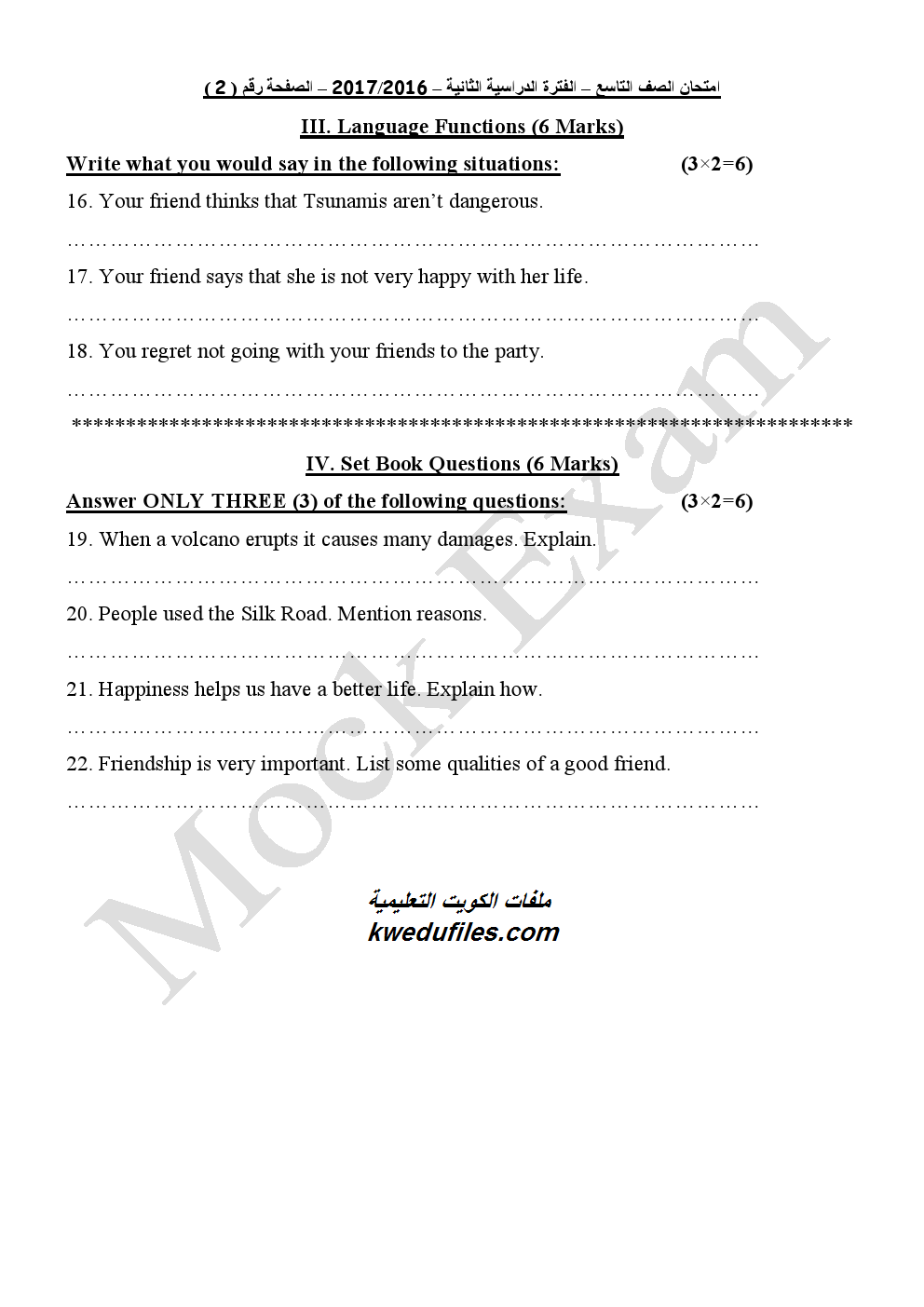 معلومات الملف: اختبار تجريبي للصف التاسع في مادة اللغة الانكليزية | ||