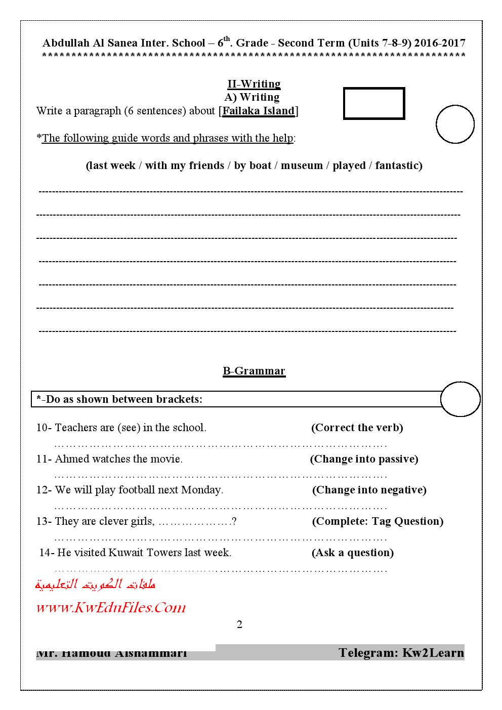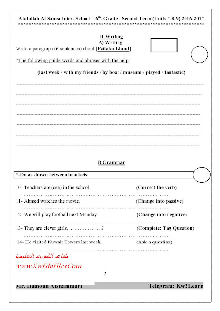 معلومات الملف: ورقتين في مادة اللغة الانكليزية للصف السادس للفصل الدراسي الثاني تتضمن نموذج اختبار | ||