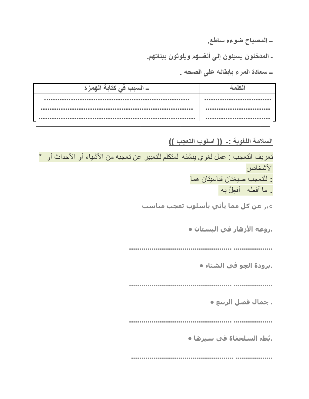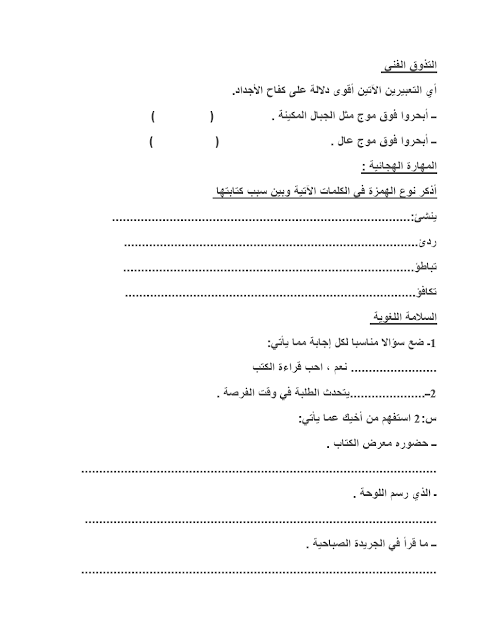 10. لغة عربية, الفصل الأول, 2025-2026, اختبار تجريبي قصير أول