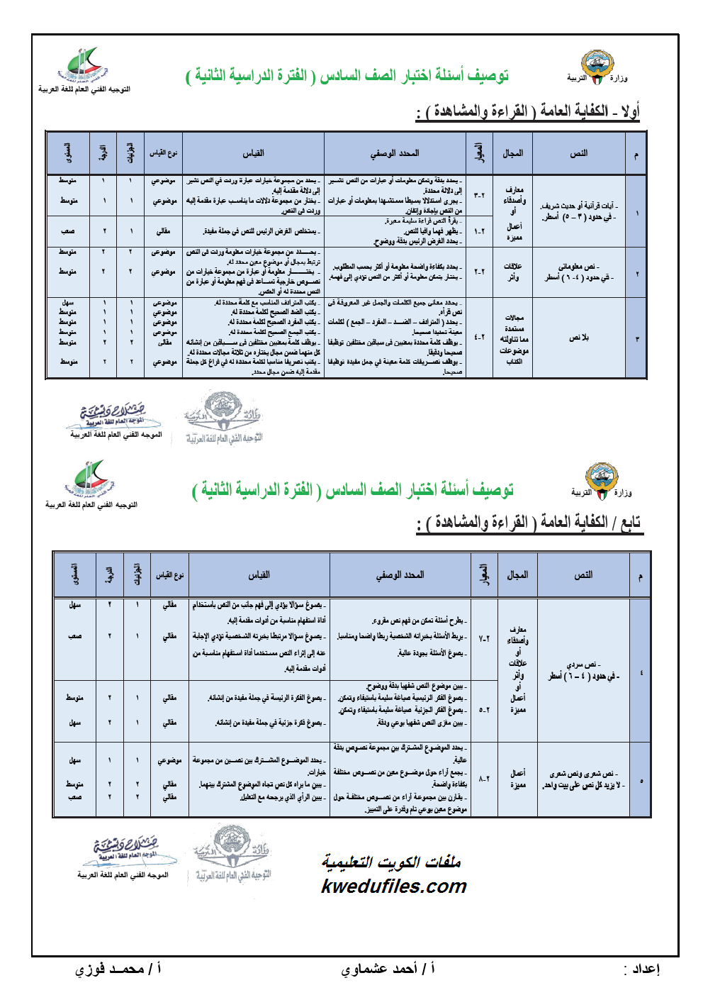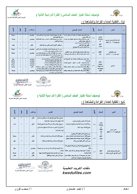 توصيف اختبار الصف السادس - إعداد: الاستاذ احمد العشماوي ومحمد فوزي
