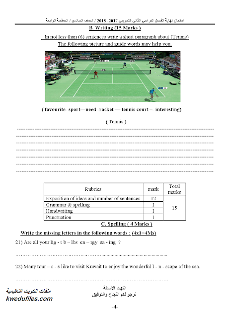 امتحان تجريبي للصف السادس لمادة اللغة الانكليزية في اربع صفحات