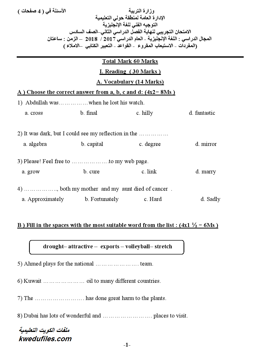 6th grade mock exam - إعداد: التوجيه الفني العام للغة الانجليزية