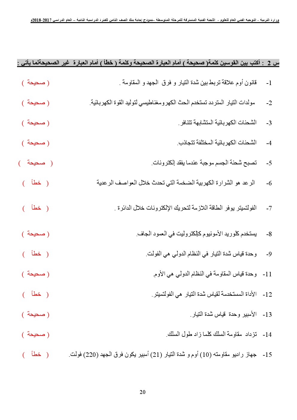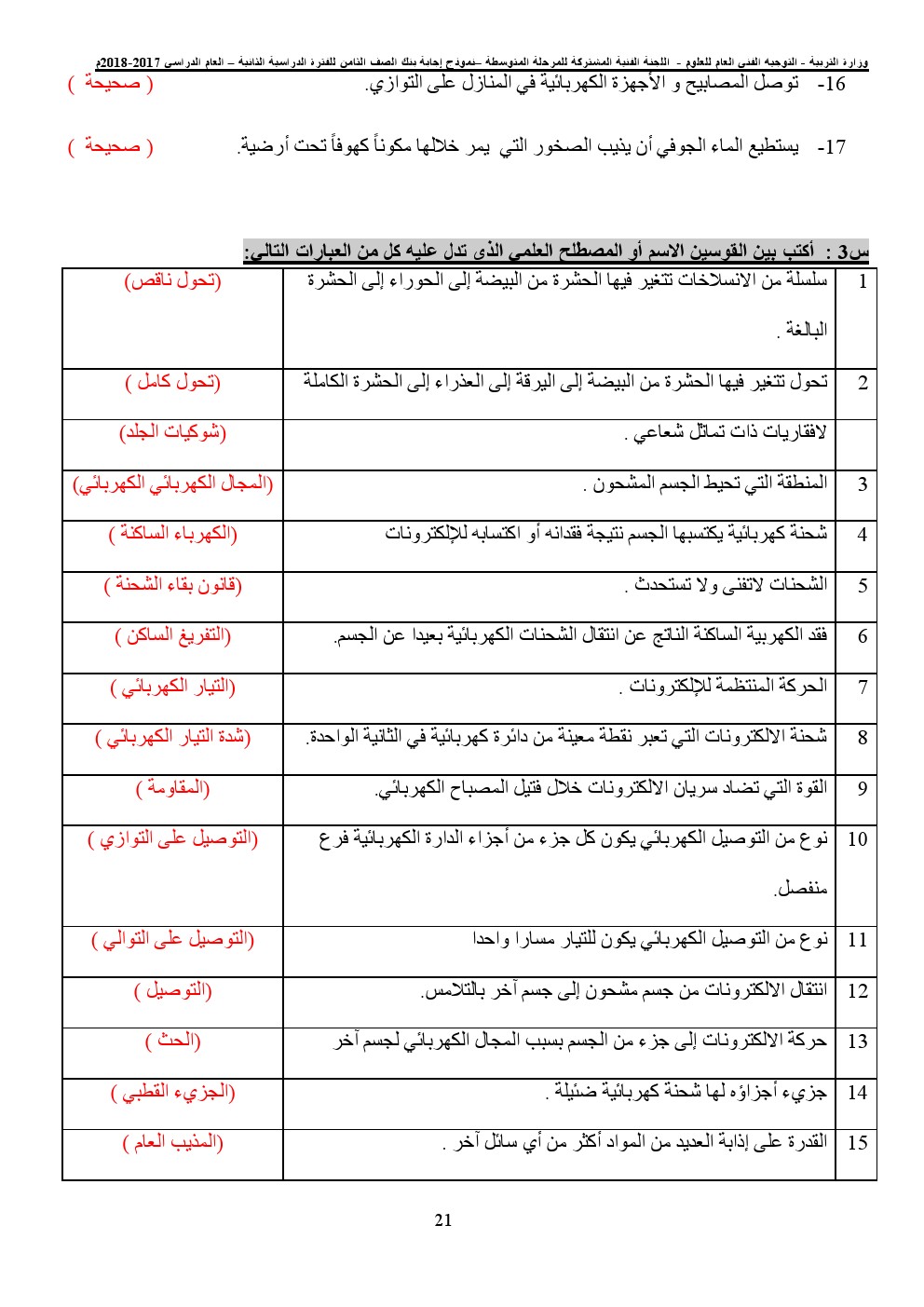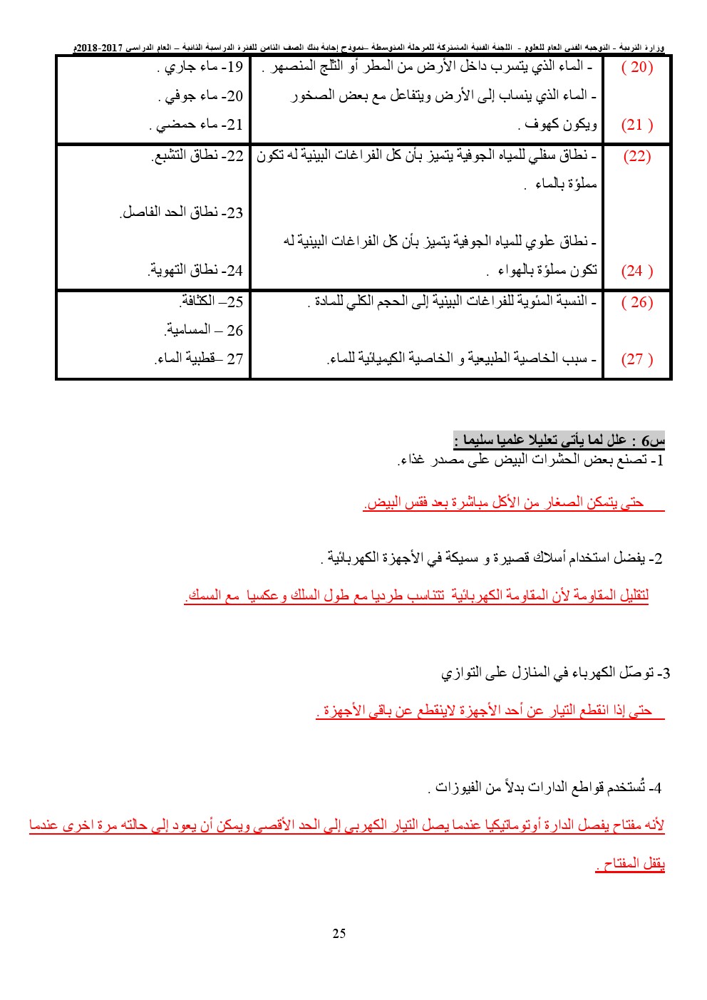 8. علوم, الفصل الأول, 2025-2026, نموذج تقويمي تدريبي ثاني شامل