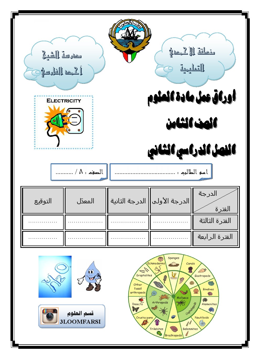 معلومات الملف: 18 ورقة في مادة العلوم للصف الثامن للفصل الدراسي الثاني تتضمن أوراق عمل مفيدة تابعة للادارة العامة لمنطقة الاحمدي التعليمية | ||