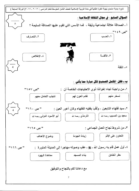 نموذج اجابة اختبار للصف الثامن في مادة التربية الاسلامية في ثمان صفحات