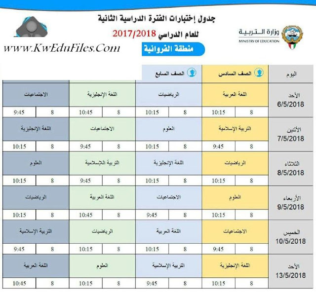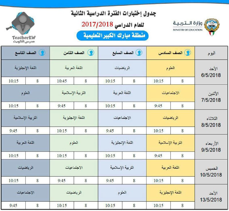 7 اوراق تتضمن جدول مواعيد الاختبارات لجميع المناطق التعليمية :منطقة مبارك الكبير التعليمية ومنطقة الفروانية التعليمية وكذلك منطقة الجهراء التعليمية ومنطقة حولي التعليمية ومنطقة الاحمدي التعليمية ومنطقة العاصمة التعليمية للفصل الدراسي الثاني من العام 2017_2018 | ||