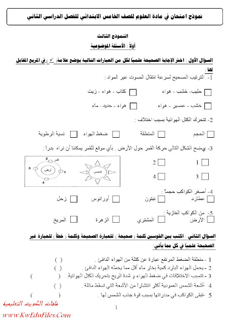 أنت هنا: موقع المناهجالمناهج الكويتية الصف الخامس علوم الفصل الثاني الامتحان النهائي