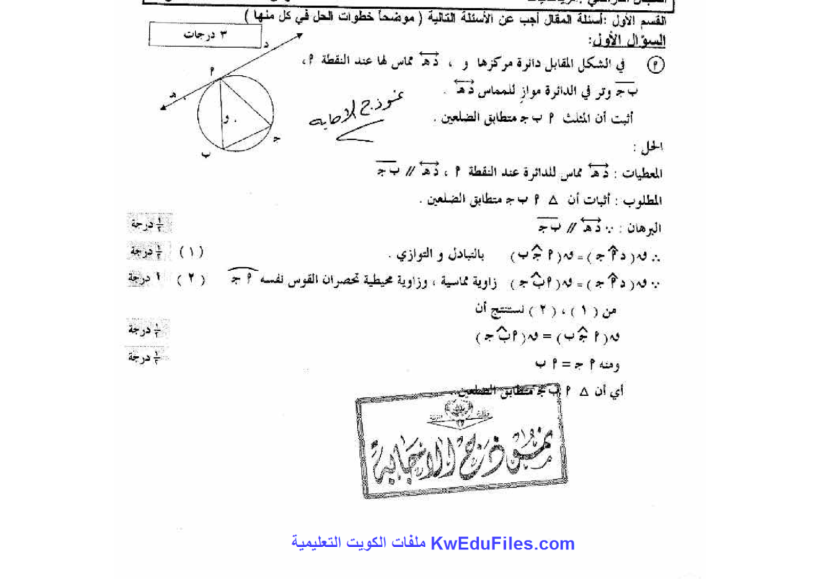 معلومات الملف: مجموعة اوراق حول هندسة الدائرة تتضمن اسئلة امتحانية متنوعة و محلولة وفق سلم تصحيح نموذجي مع توزيع للعلامات في 28 ورقة | ||