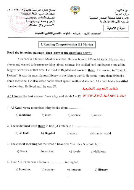 | نموذج اجابة اختبار في مادة اللغة الانكليزية - إعداد: منطقة الأحمدي التعليمية | ||