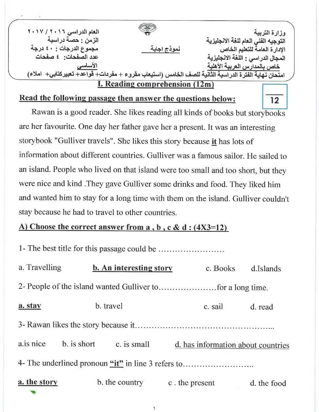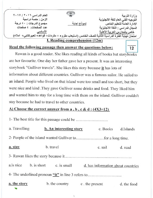 نموذج اجابة اختبار في مادة اللغة الانكليزية - إعداد: منطقة الأحمدي التعليمية