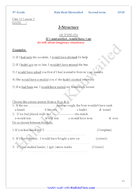معاني مفردات الوحدة السابعة وأسئلة وقواعد وتدريبات غير محلولة, مدرسة هالة بنت خويلد, الصف التاسع, لغة انجليزية, الفصل الثاني, 2017-2018 - المناهج الكويتية