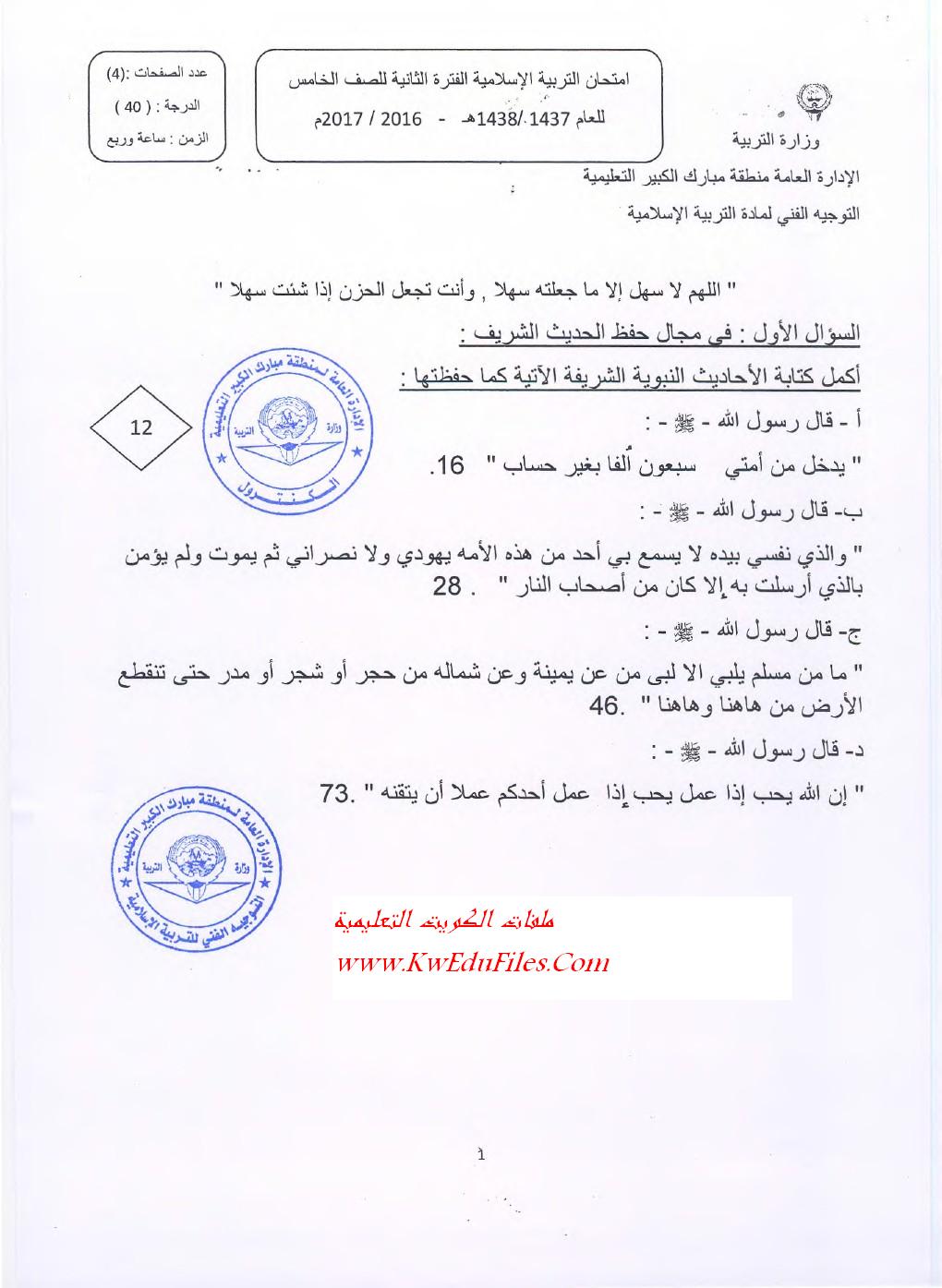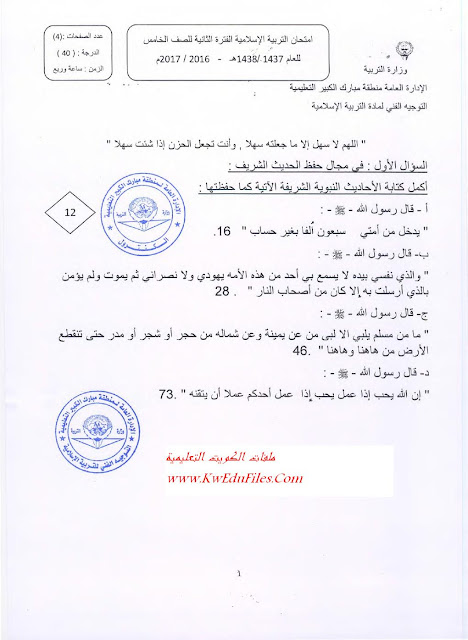 نموذج اختبار مهم ومفيد في مادة التربية الاسلامية - إعداد: منطقة مبارك الكبير التعليمية | ||