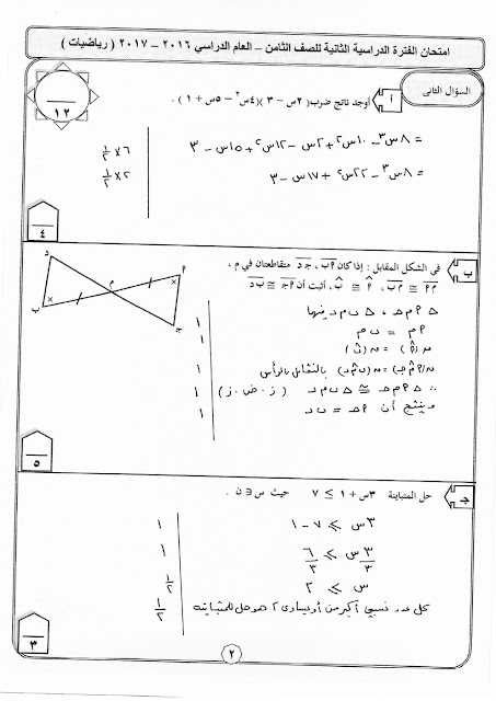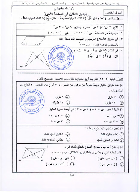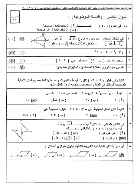 49 ورقة في مادة الرياضيات للصف الثامن للفصل الدراسي الثاني تتضمن نماذج اختبارات مهمة