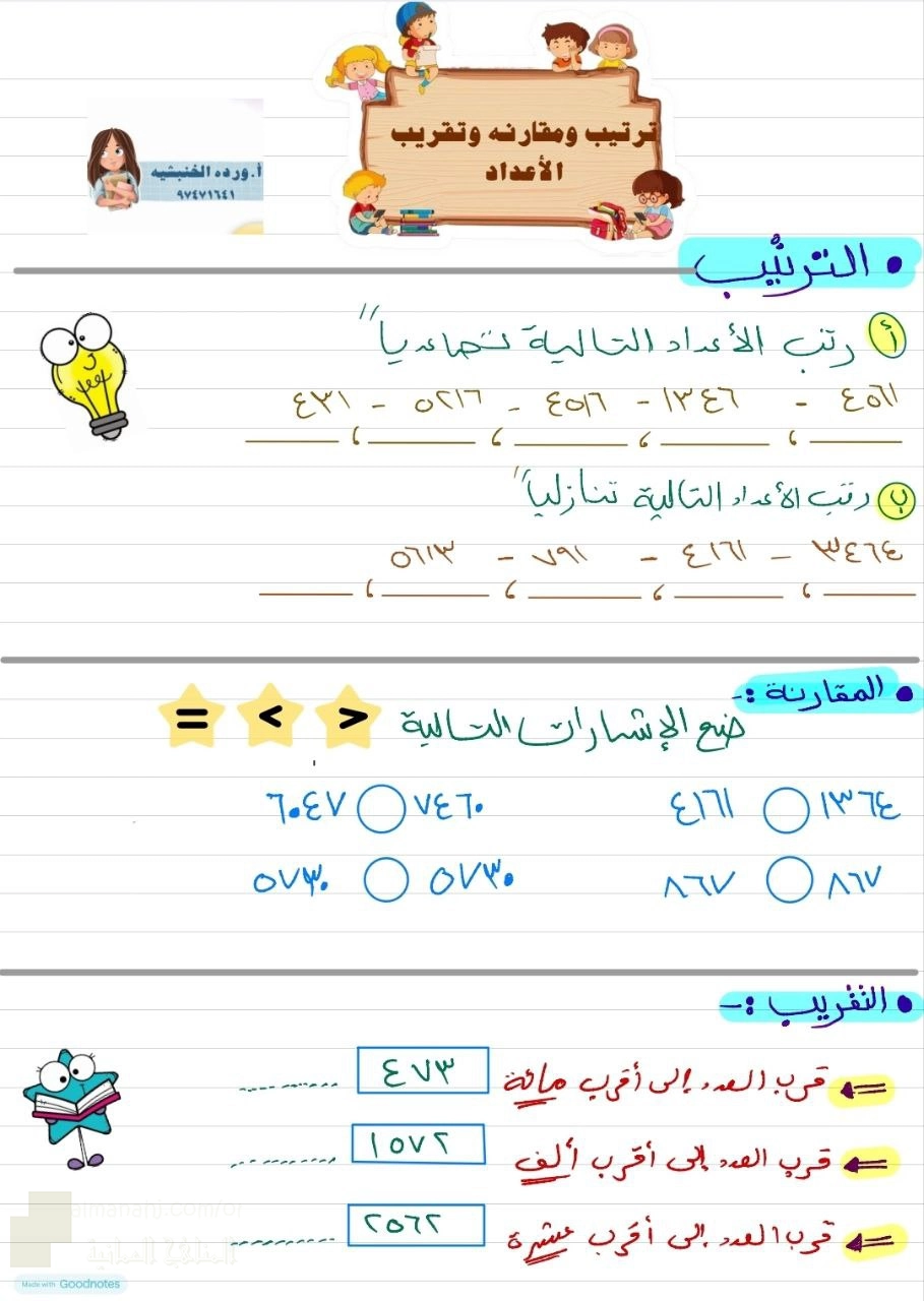 ورقة عمل في ترتيب ومقارنة وتقريب الأعداد - إعداد: وردة الخنبشية