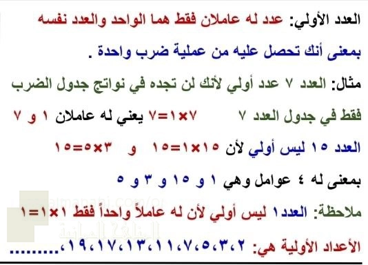 معنى العدد الأولي مع الأمثلة من مادة الرياضيات للصف السادس الفصل الدراسي الأول