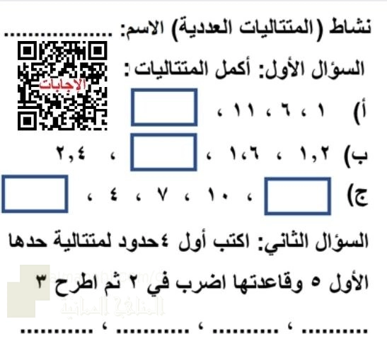 معلومات الملف: نقدم لكم ملف يتضمن نشاط درس المتتاليات العددية ويشمل أسئلة هامة و شاملة لأفكار الدرس غير محلولة من مادة الرياضيات الفصل الدراسي الأول