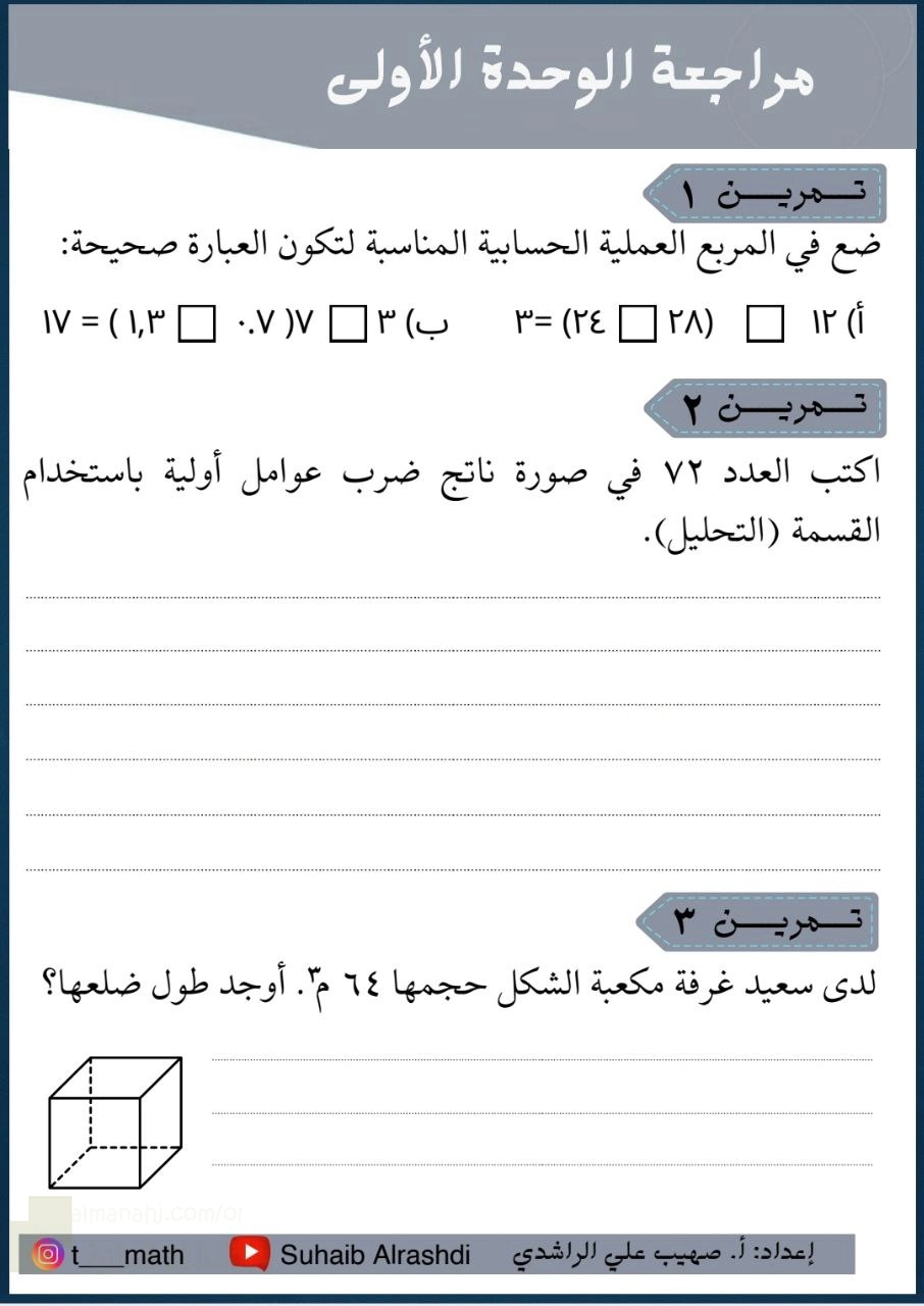 معلومات الملف: أعزائي الطلبة نقدم لكم ملف يتضمن مراجعة على الوحدة الأولى ويشمل واحد و عشرون تمارين يتناول جميع دروس الوحدة ومنها العمليات الحسابية و الجذور التكعيبية و التربيعية و التحليل للأعداد الأولية و المضاعفات وغيرها