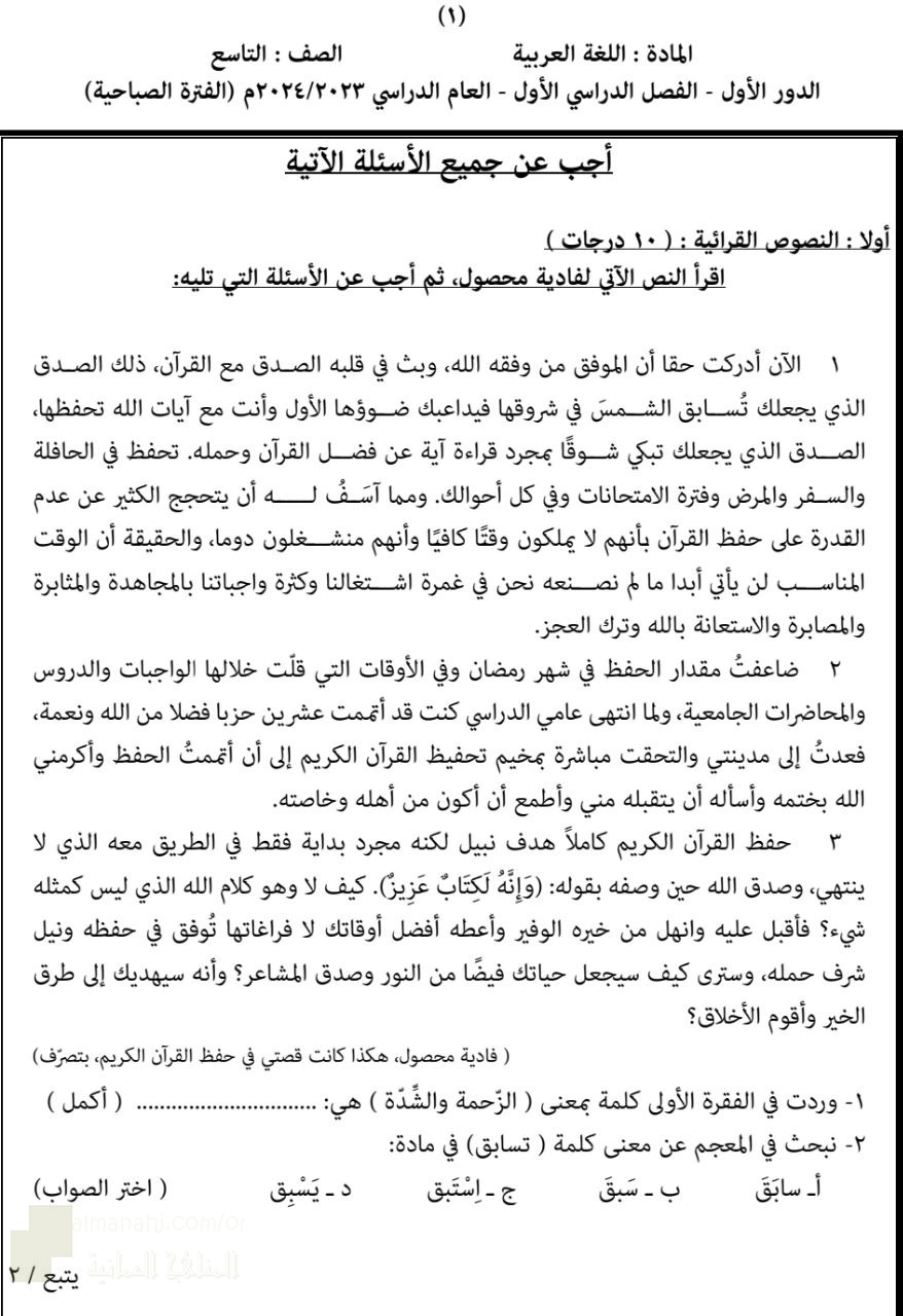 3. الصف الثامن, لغة عربية, تجميع أسئلة ونماذج إجابة الاختبار القصير الثاني