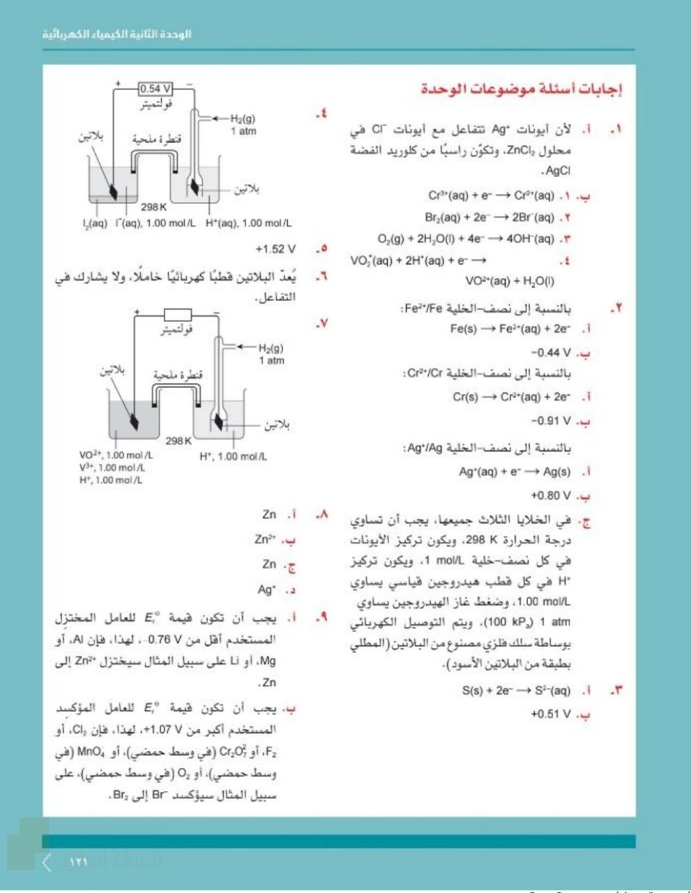 إجابات أسئلة موضوعات الوحدة الثانية ( الكيمياء الكهربائية )