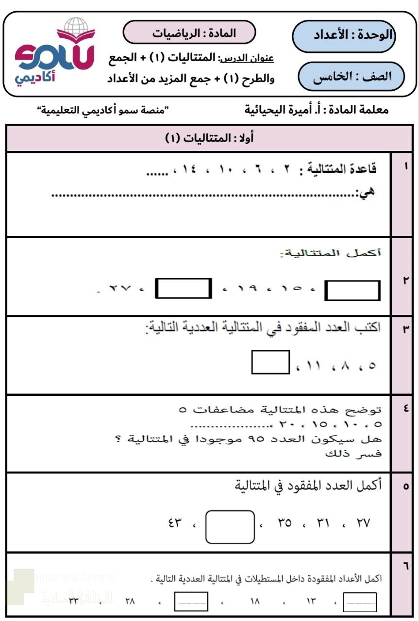 تم إيجاد الملف: مراجعة درس المتتاليات (١) والجمع والطرح (١) وجمع المزيد من الأعداد من وحدة الأعداد