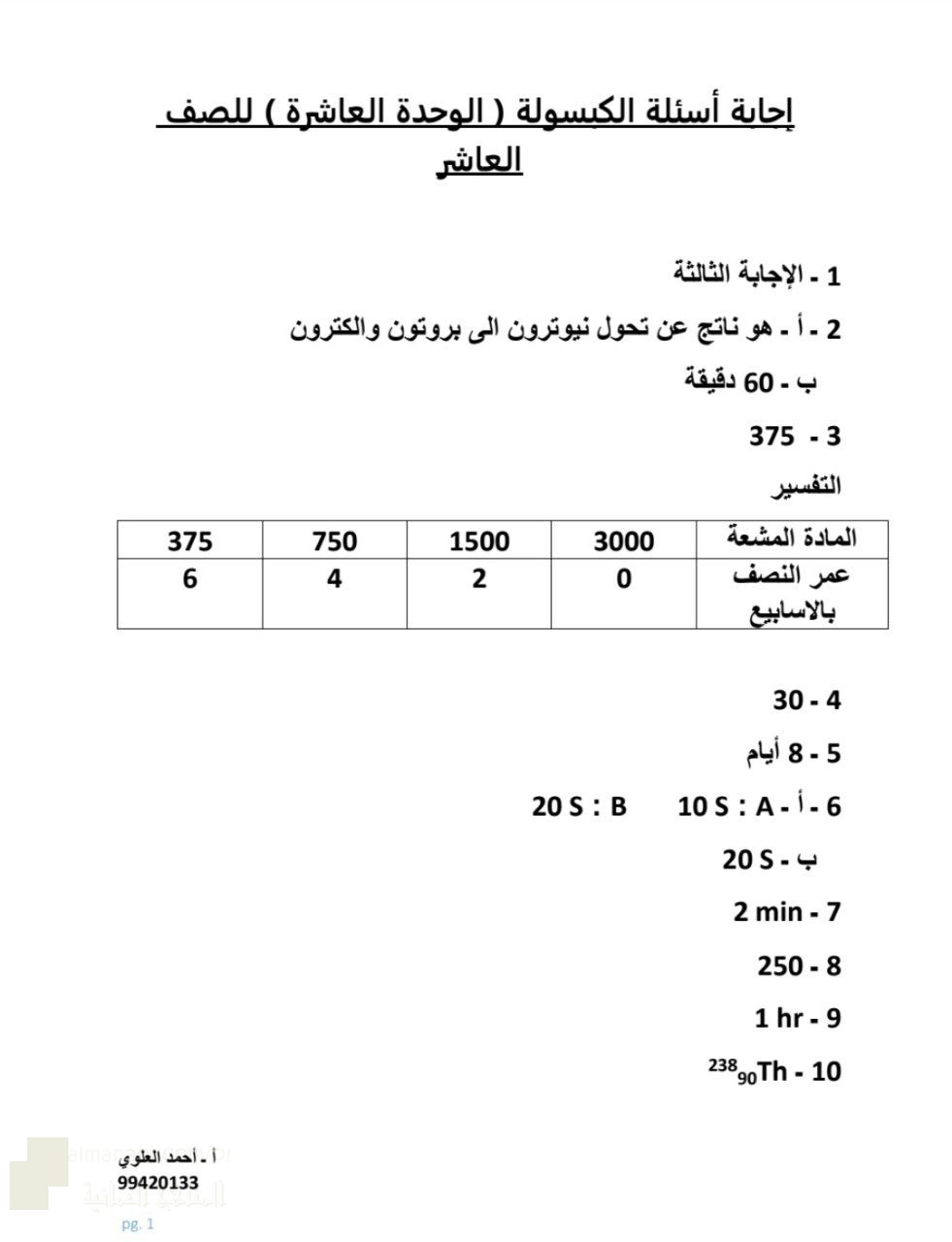 إجابات الكبسولة الإثرائية للوحدة العاشرة (الاضمحلال الإشعاعي وعمر النصف ) - إعداد: أحمد العلوي
