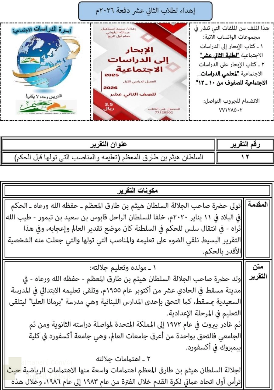 معلومات الملف: نرفق لكم ملف يتضمن تقرير عن السلطان هيثم بن طارق المعظم ( تعليمه و المناصب التي تولها قبل الحكم ) من سلسلة الإبحار إلى الدراسات الإجتماعية إهداء لطلاب الثاني عشر دفعة 2026 م ويشمل: