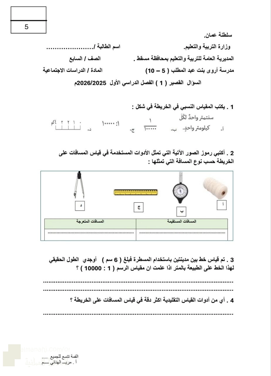 معلومات الملف: أعزائي الطلبة نقدم لكم ملف يتضمن اختبار قصير أول بمحافظة مسقط 2025 - 2026 م في مادة الدراسات الإجتماعية ويشمل أسئلة حول قياس المسافات على الخريطة