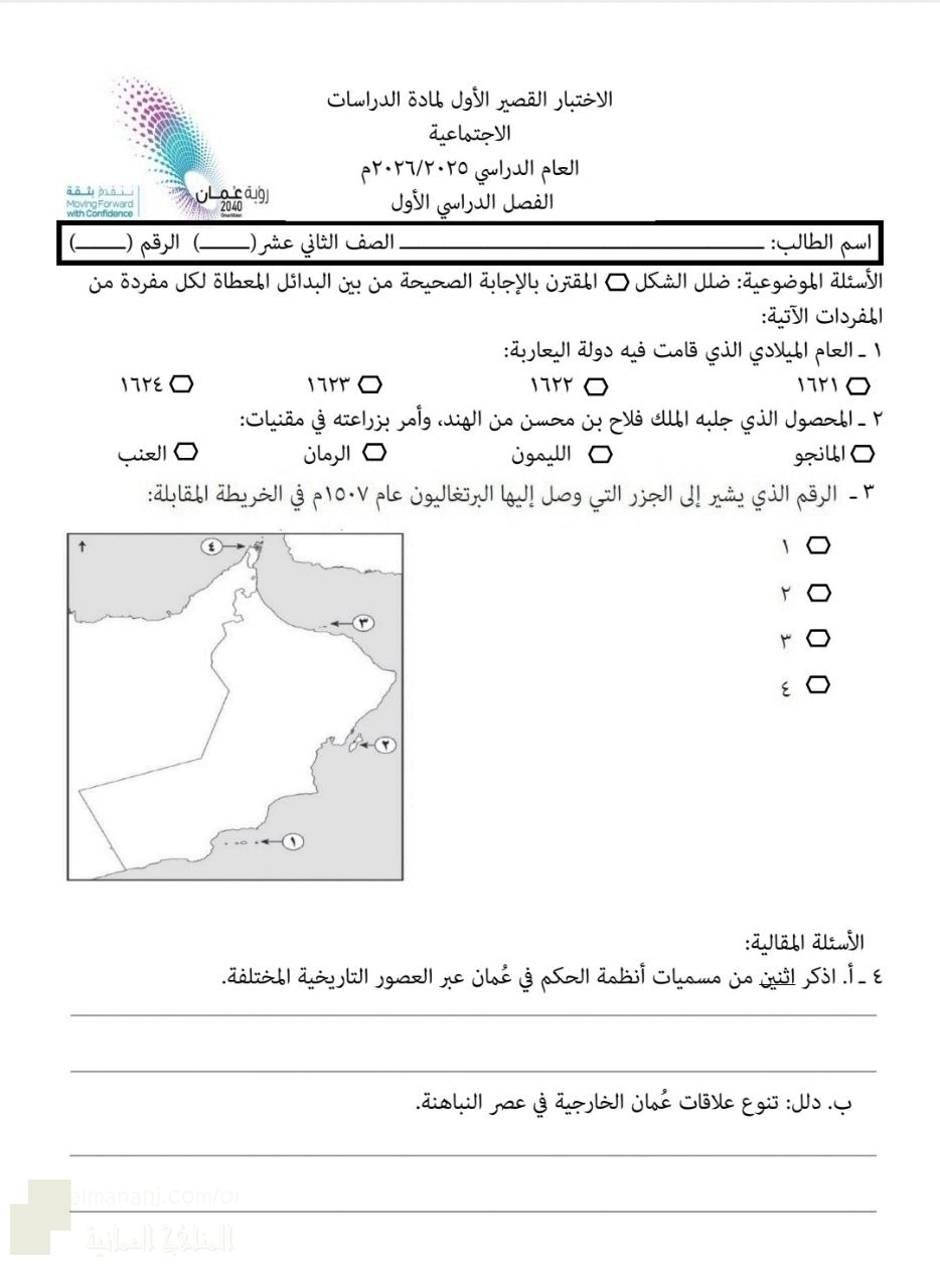 15. الصف السابع, رياضيات, اختبار قصير أول 2025-2026 في محافظة مسقط