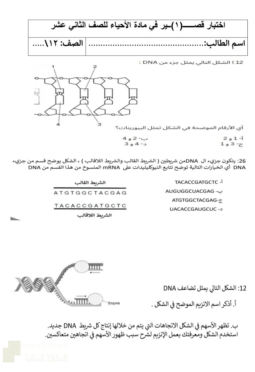 7. الصف الثاني عشر, أحياء, اختبار قصير أول في الوحدة الأولى الأحماض النووية وتخليق البروتين