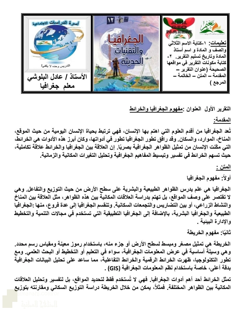 التقرير الأول عن مفهوم الجغرافيا والخرائط, عادل البلوشي, الصف الثاني عشر, جغرافيا, الفصل الأول, 2025/2026 - المناهج العمانية
