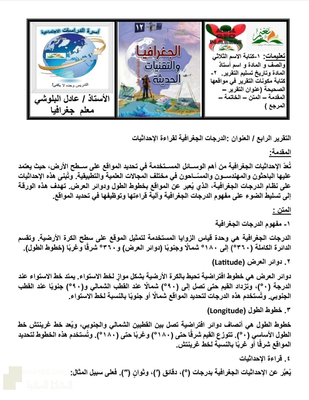 معلومات الملف: أعزائي الطلبة نقدم لكم ملف يتضمن التقرير الرابع بعنوان الدرجات الجغرافية لقراءة الإحداثيات ويشمل: