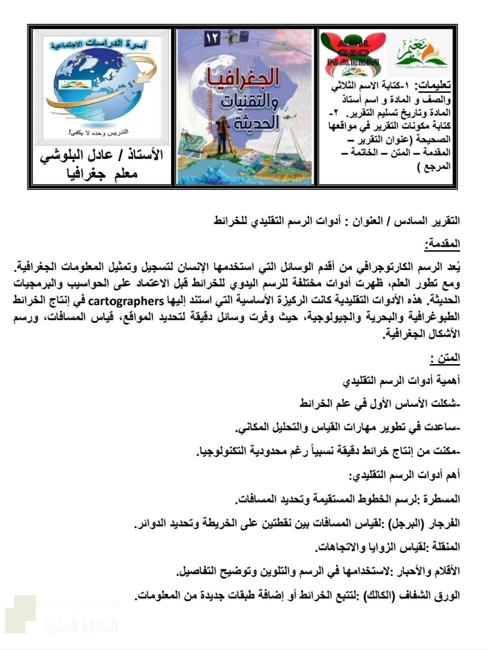 معلومات الملف: أعزائي الطلبة نقدم لكم ملف يتضمن التقرير السادس بعنوان أدوات الرسم التقليدي للخرائط ويشمل: