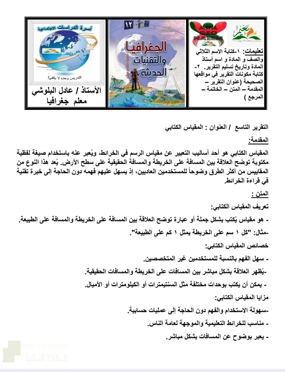 معلومات الملف: أعزائي الطلبة نقدم لكم ملف يتضمن التقرير التاسع عن المقياس الكتابي ويشمل: المقدمة : المقياس الكتابي هو أحد أساليب التعبيرعن مقياس الرسم في الخرائط المتن : تعريف المقياس الكتابي خصائص المقياس الكتابي مزايا المقياس الكتابي عيوب المقياس الكتابي الخاتمة : يُعد المقياس الكتابي أداة مهمة في علم الخرائط لكونه يتيح للمستخدمين فهماً مبسطاً للمسافات الممثلة على الخرائط المراجع