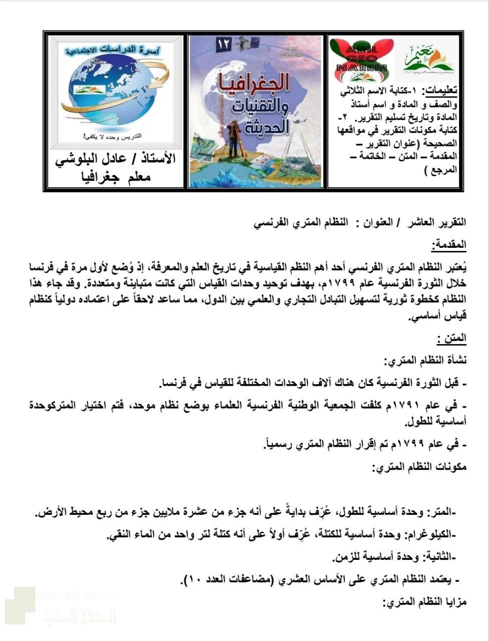 معلومات الملف: أعزائي الطلبة نقدم لكم ملف يتضمن التقرير العاشر عن النظام المتري الفرنسي ويشمل : المقدمة : يُعتبر النظام المتري الفرنسي أحد أهم النظم القياسية في تاريخ العلم و المعرفة المتن : نشأة النظام المتري مزايا النظام المتري انتشار النظام المتري الخاتمة : إن النظام المتري الفرنسي لم يكن مجرد ابتكار تقني بل كان مشروعاً حضارياً هدفه توحيد معايير القياس و تسهيل التواصل بين الأمم المراجع