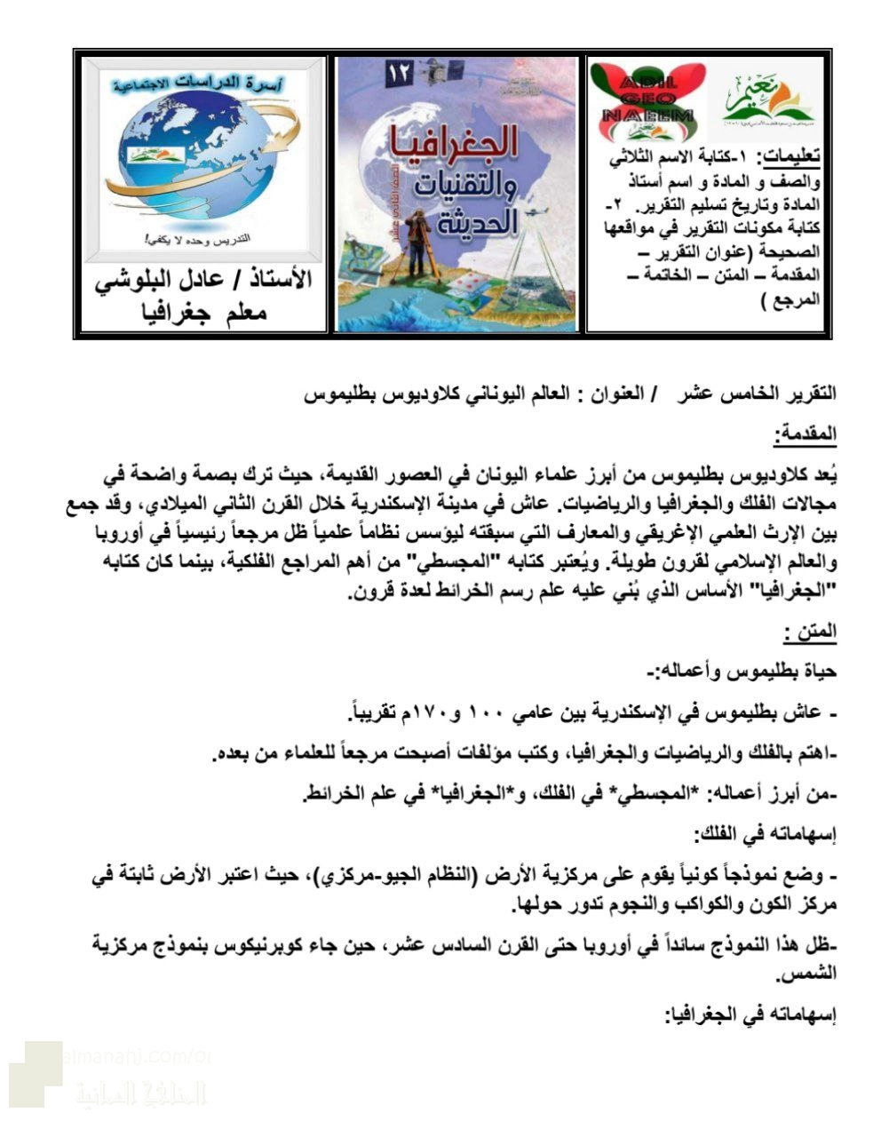 11. الصف الثاني عشر, جغرافيا, التقرير الخامس عشر عن العالم اليوناني كلاوديوس بطليموس