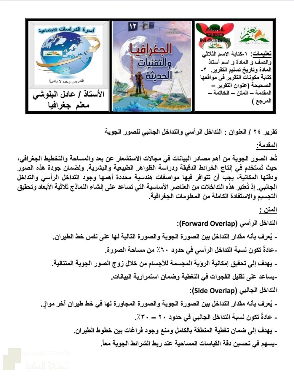 معلومات الملف: أعزائي الطلبة نقدم لكم ملف يتضمن التقرير (٢٤) عن التداخل الرأسي و التداخل الجانبي للصور الجوية ويشمل: