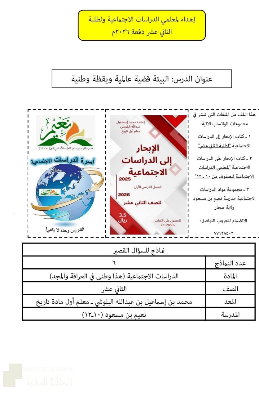 ستة نماذج من الاختبارات القصيرة حول درس البيئية قضية عالمية ويقظة وطنية, محمد بن إسماعيل عبدالله البلوشي, الصف الثاني عشر, هذا وطني, الفصل الأول, 2025/2026 - المناهج العمانية