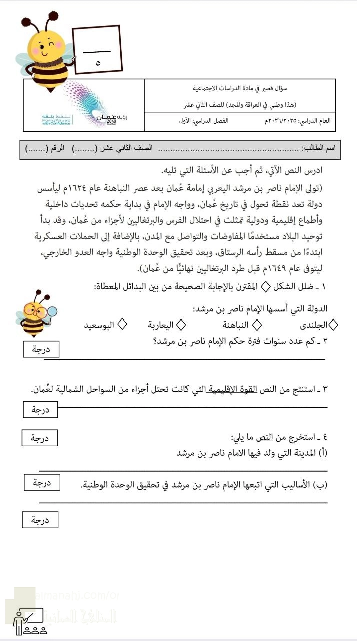 12. هذا وطني, الفصل الأول, 2025/2026, سؤال قصير نموذج رابع حول درس عمان في عصر اليعاربة قوة وازدهار
