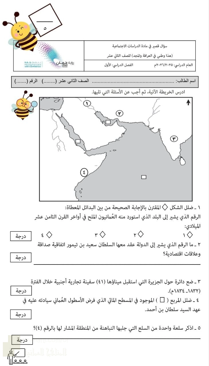 15. الصف الثاني عشر, هذا وطني, سؤال قصير نموذج رابع حول درس عمان في عصر البوسعيد وحدة ومنجزات