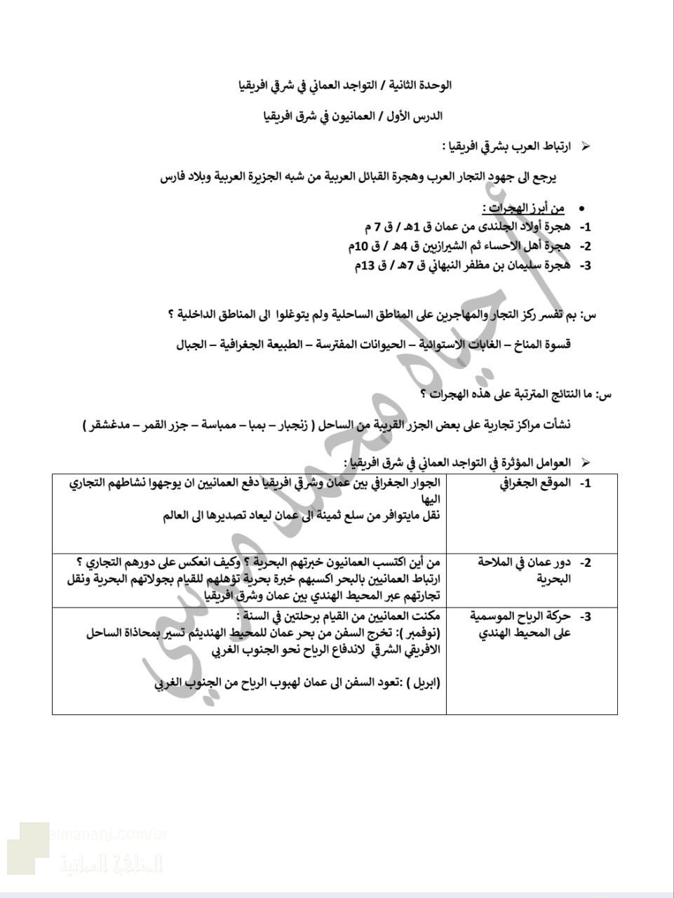 8. الصف التاسع, اجتماعيات, مراجعة عامة على الوحدة الثانية التواجد العماني في شرق افريقيا