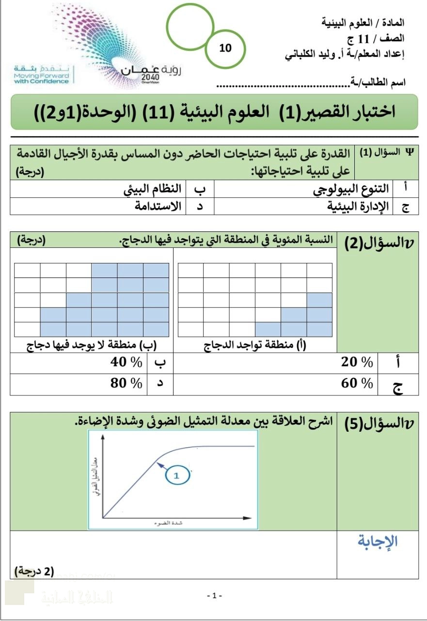 3. الصف الحادي عشر, علوم بيئية, اختبار قصير أول في الوحدتين الأولى والثانية مع نموذج الإجابة