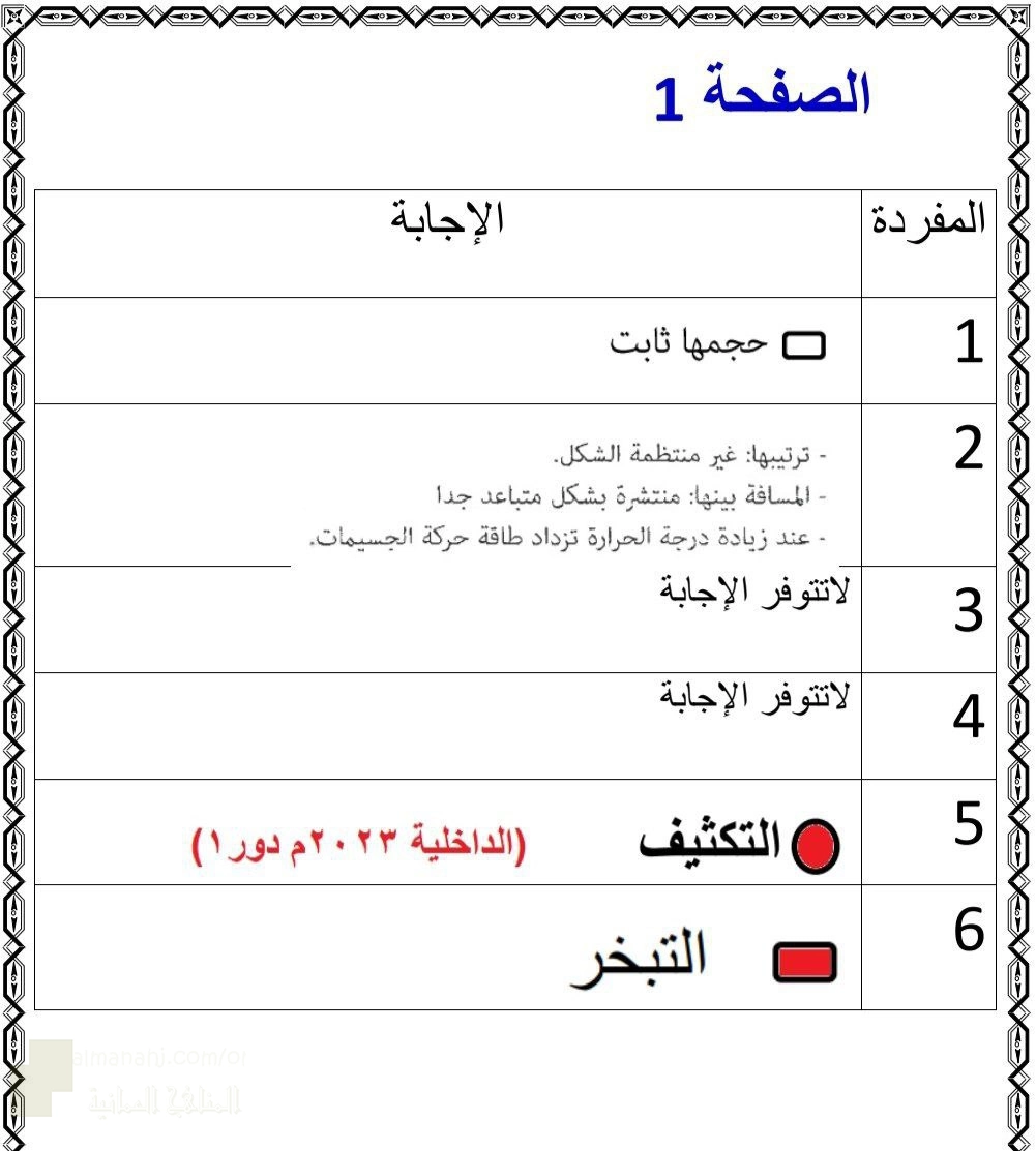 8. ملخص درس حالات المادة من الوحدة الأولى بطريقة سؤال وجواب