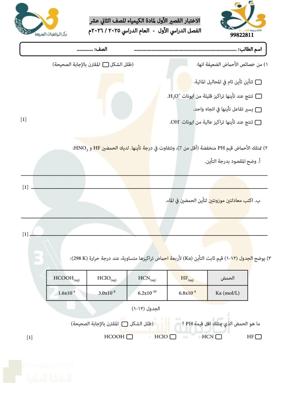 2. الصف الثاني عشر, كيمياء, الاختبار القصير الأول في وحدة الاتزان في المحاليل المائية
