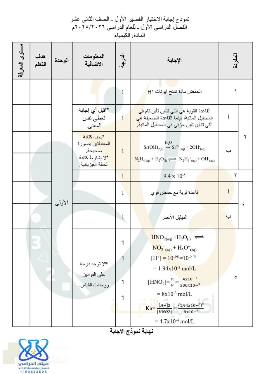 6. الصف الثاني عشر, كيمياء, نموذج إجابة الاختبار القصير الأول من أكاديمية النخبة نموذج ثاني