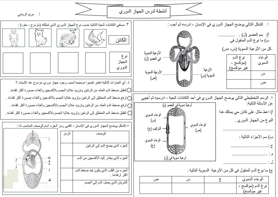 12. الصف العاشر, أحياء, أنشطة لدرس الجهاز الدوري
