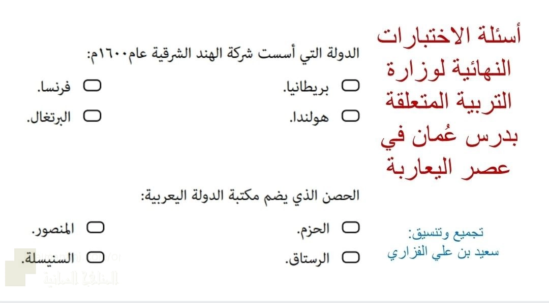1. الصف الثاني عشر, اجتماعيات, أسئلة الاختبارات النهائية لوزارة التربية المتعلقة بدرس عمان في عصر اليعاربة