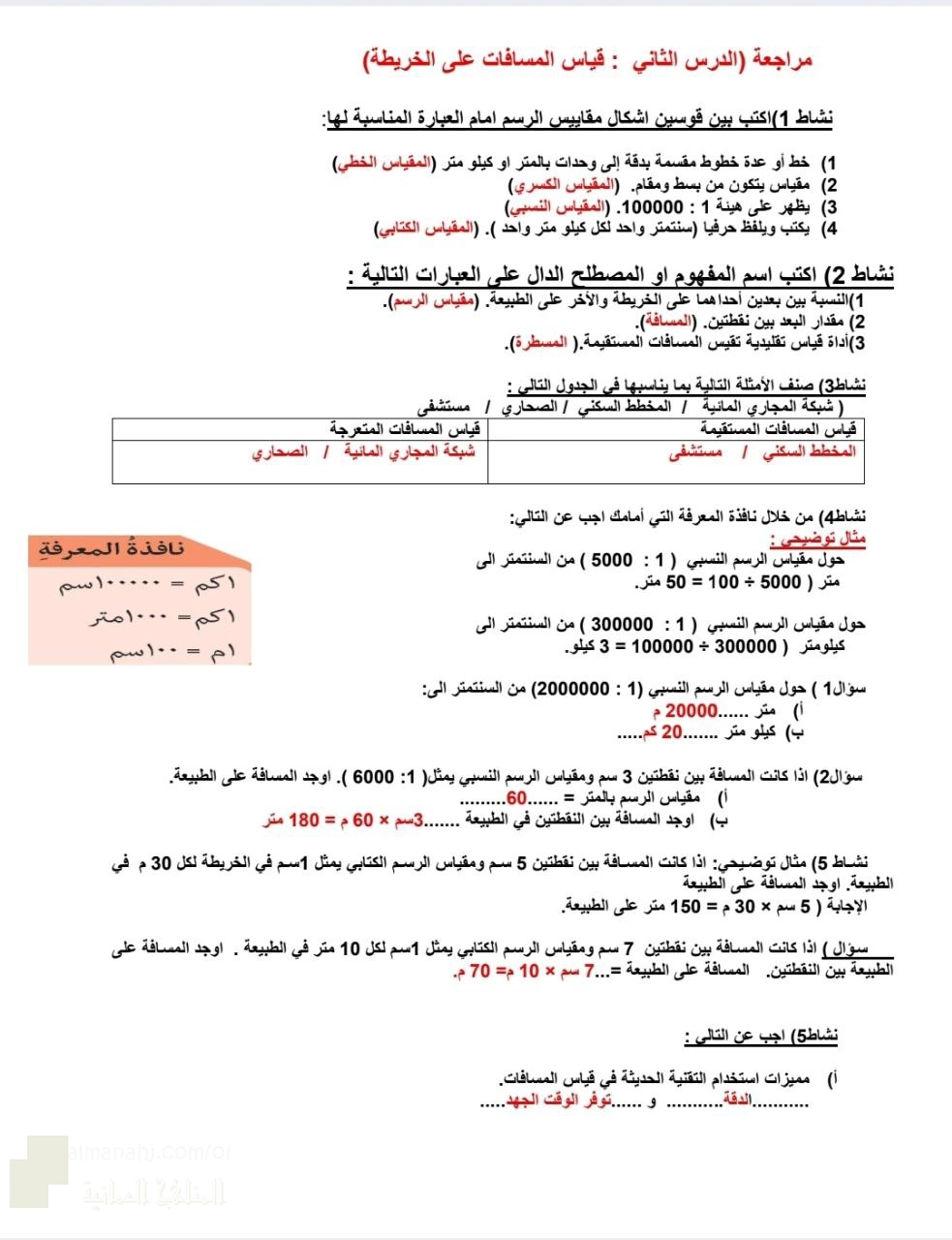 7. الصف السابع, اجتماعيات, مراجعة الدرسين الثاني (قياس المسافات على الخريطة) والثالث (حساب المساحات على الخريطة)