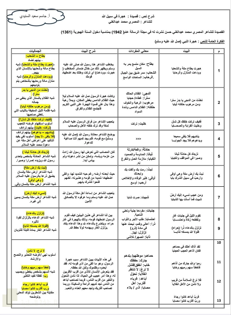 5. الصف الثامن, لغة عربية, ملخص شرح أبيات قصيدة هجرة في سبيل الله