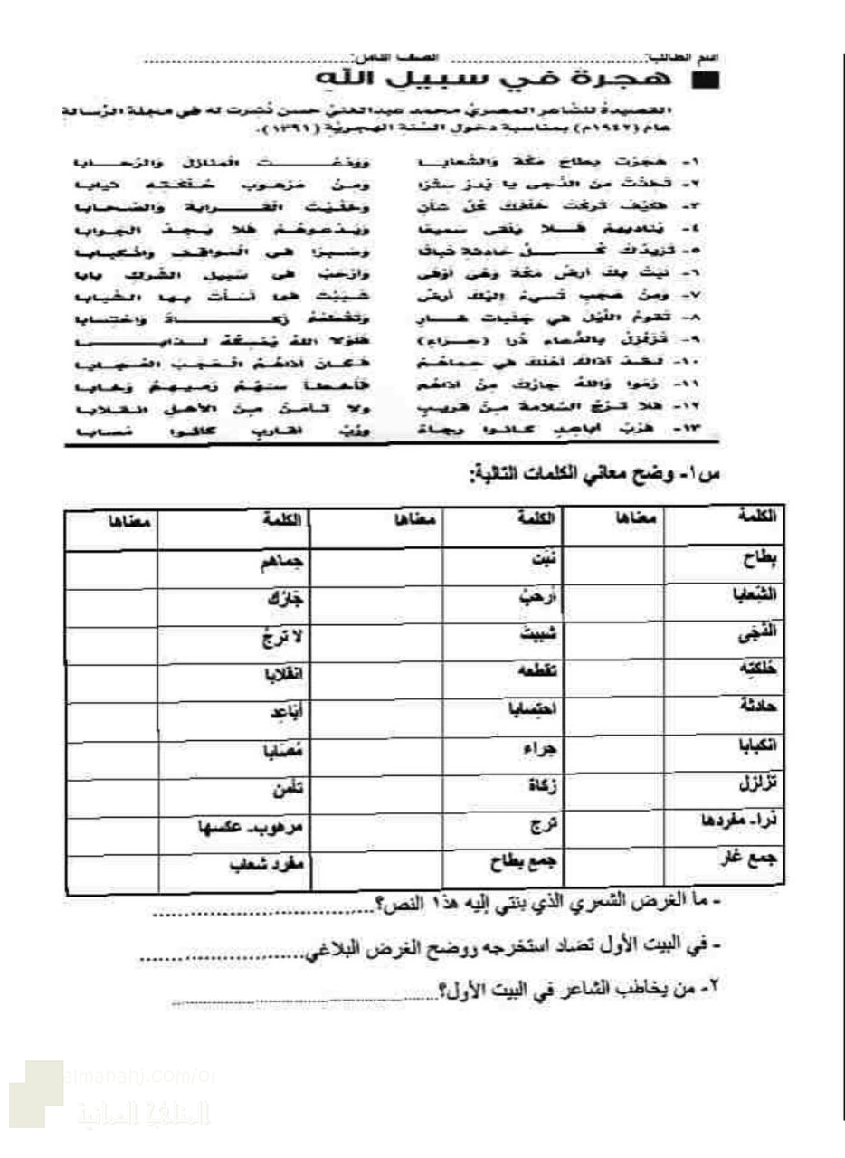 4. الصف الثامن, لغة عربية, ورقة عمل حول قصيدة هجرة في سبيل الله