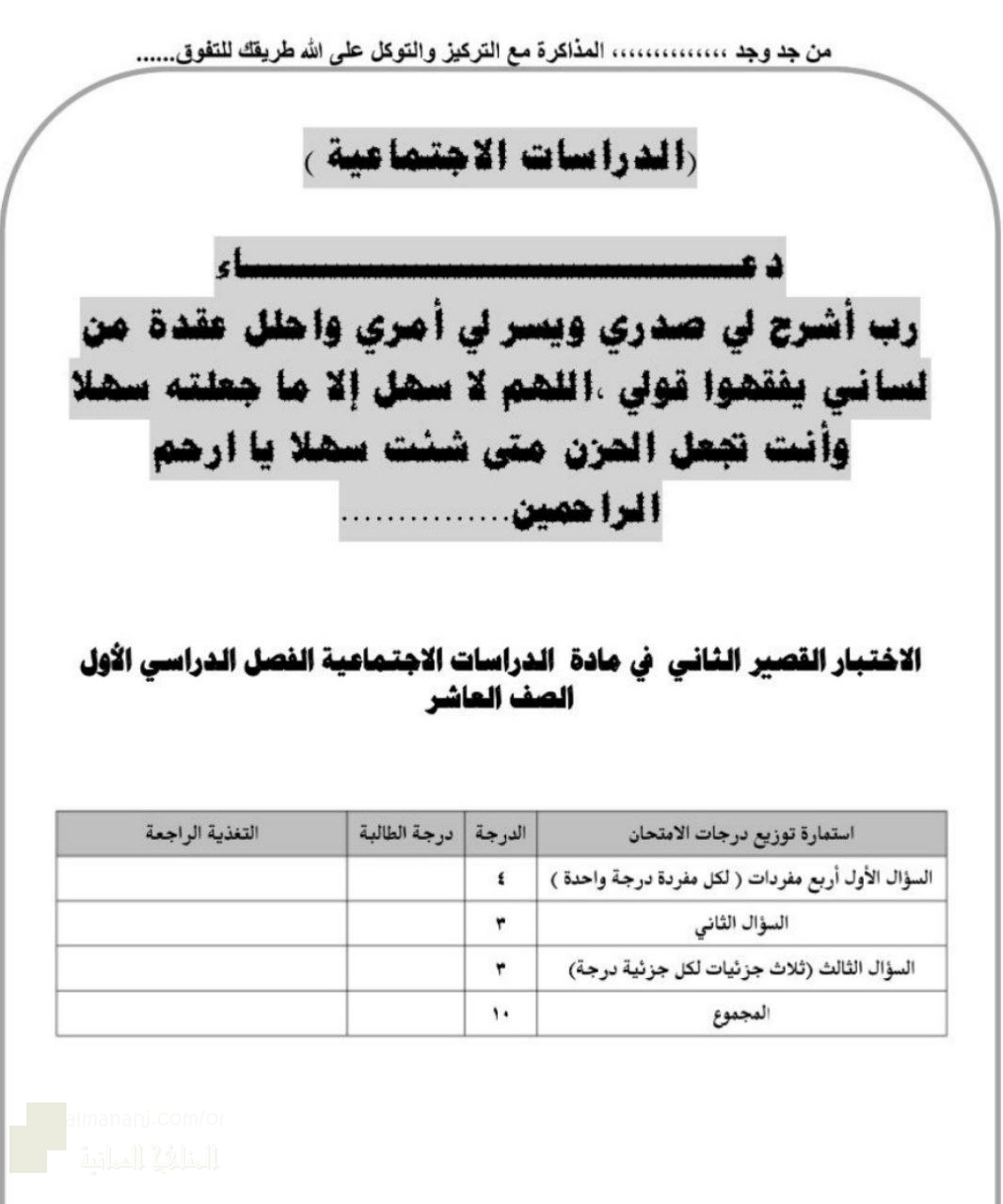 2. الصف العاشر, اجتماعيات, اختبار قصير ثاني وسؤال قصير أول
